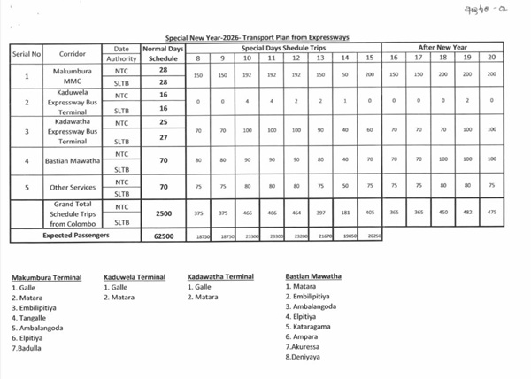 Authorities expect nearly 1.5 million passengers to arrive at bus and railway terminals in Colombo and surrounding towns during the festive period. Sanitary facilities, security measures, and first aid services have been arranged at bus terminals, with officials assigned for special duties.