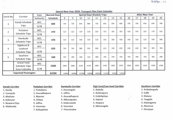 The National Transport Commission (NTC), in collaboration with the Department of Railways and the Sri Lanka Transport Board (SLTB), has announced an integrated transport plan to facilitate passenger travel during the Sinhala and Tamil New Year period from April 8 to 20, 2026.