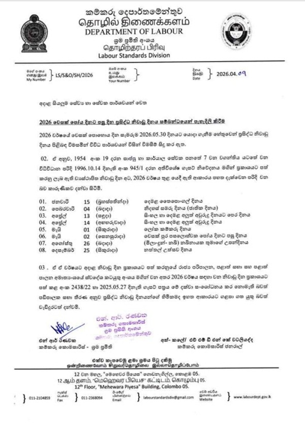 The Commissioner General of Labour, N.A.P. Ranawaka, has issued a statement confirming the list of public holidays for 2026, following inquiries regarding the mercantile holiday for the day following Vesak Poya, scheduled for May 2, and Vesak Poya celebrations scheduled for May 30.