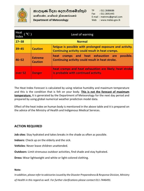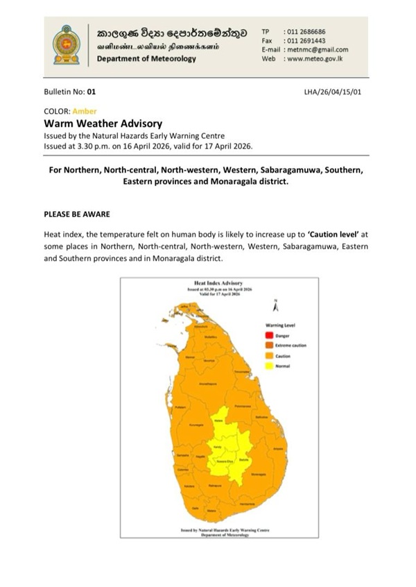 The Department of Meteorology has issued an advisory for warm weather in the Northern, North-central, North-western, Western, Sabaragamuwa, Southern, Eastern provinces and the Monaragala district.