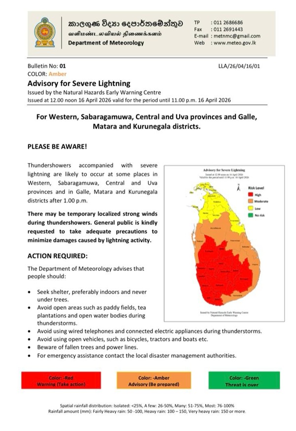 The Department of Meteorology has issued an advisory for severe lightning in the Western, Sabaragamuwa, Central and Uva provinces and the Galle, Matara and Kurunegala districts today (16).