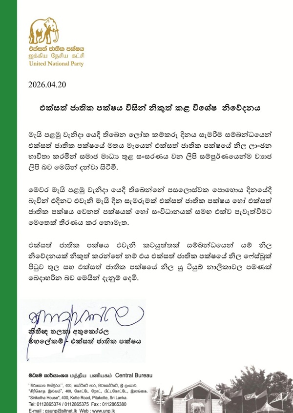 The United National Party (UNP) has issued a special statement addressing misinformation circulating on social media ahead of International Workers’ Day (May Day) on May 1.
