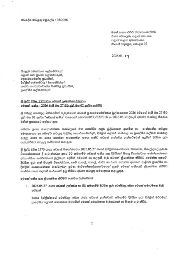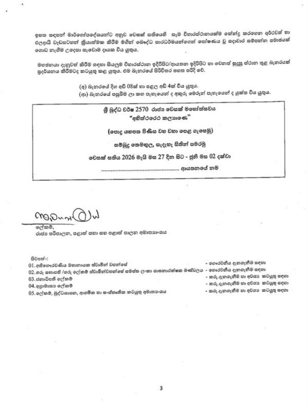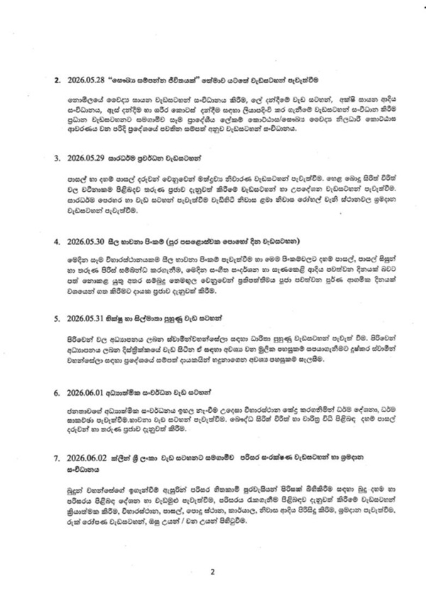According to the Ministry of Public Administration and Home Affairs, the period from May 27 to June 2 has been declared as “Vesak Week” in line with the Cabinet decision dated March 30, 2026.
