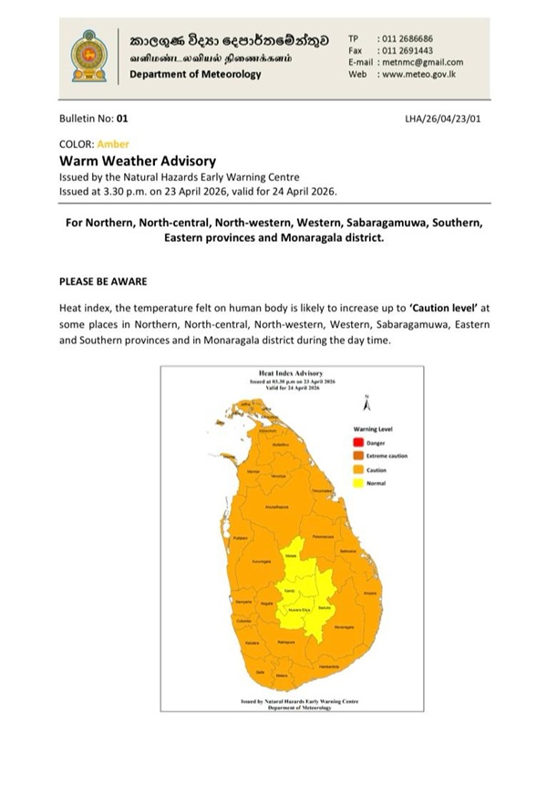 The Department of Meteorology has issued an advisory for warm weather in the Northern, North-central, North-western, Western, Sabaragamuwa, Southern, Eastern provinces and Monaragala district.