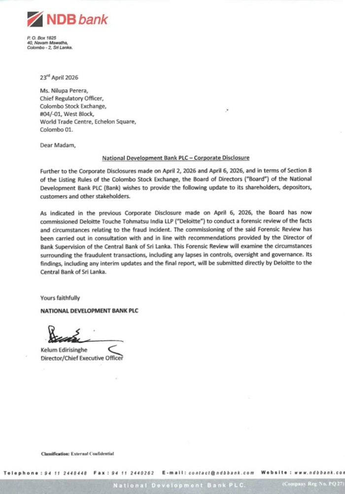 National Development Bank PLC (NDB) has commissioned Deloitte Touche Tohmatsu India LLP to conduct a forensic review into the facts and circumstances surrounding the recent fraud incident, the bank disclosed in a filing to the Colombo Stock Exchange dated April 23, 2026.