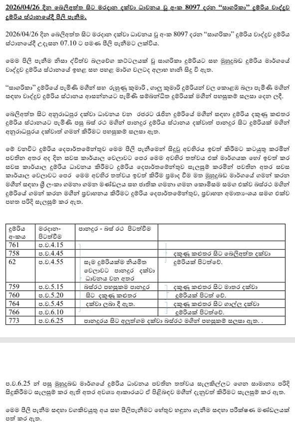 If the obstruction is not cleared in time, the Railway Department, together with the Ministry of Transport, the Sri Lanka Transport Board, and the National Transport Commission, has arranged to transport passengers by bus along the coastal route, it added.