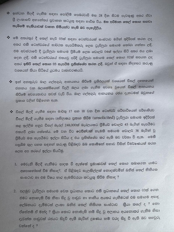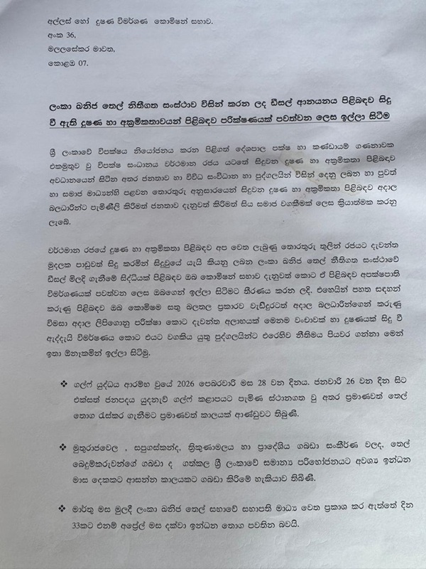 The Joint Opposition Alliance has lodged a complaint with the Commission to Investigate Allegations of Bribery or Corruption, calling for a probe into alleged corruption and irregularities linked to diesel imports by the Ceylon Petroleum Corporation (CPC).