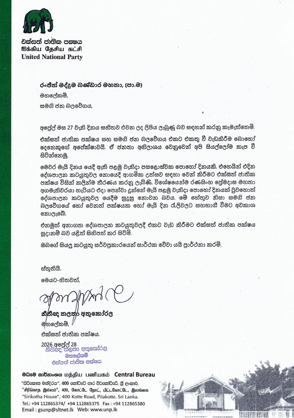 In a letter dated April 27, UNP General Secretary Thalatha Atukorale noted that while many people expect the UNP and SJB to work together, the party had already decided to refrain from political activities on May Day when it falls on a Poya day.