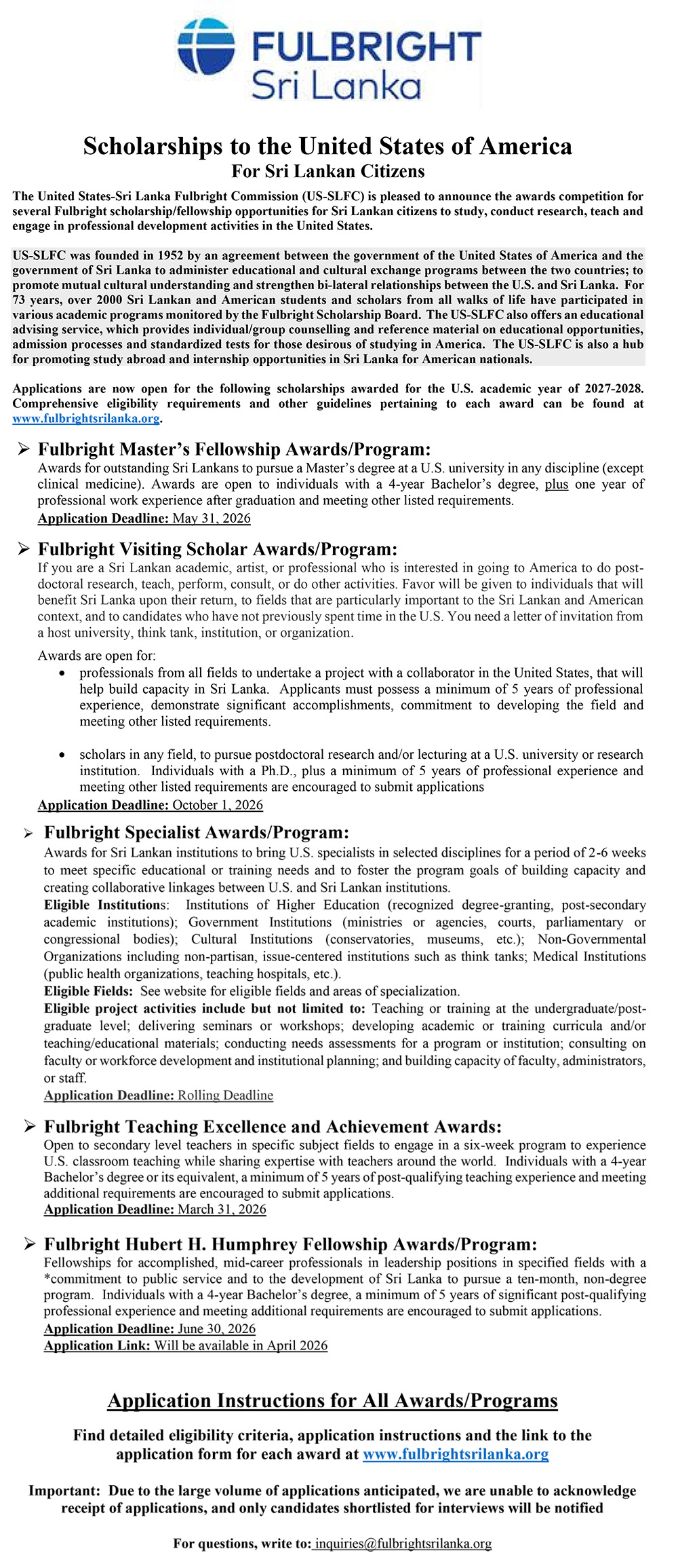 Find detailed eligibility criteria, application instructions and the link to the application form for each award at www.fulbrightsrilanka.org Important: Due to the large volume of applications anticipated, we are unable to acknowledge receipt of applications, and only candidates shortlisted for interviews will be notified For questions, write to: inquiries@fulbrightsrilanka.org