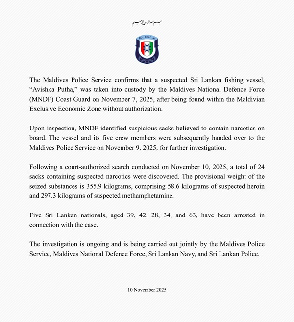 The Maldivian Police has confirmed that a large haul of narcotics was seized from the Sri Lankan vessel ‘Avishka Putha’ that was taken into custody after being found within the Maldivian Exclusive Economic Zone without authorization.