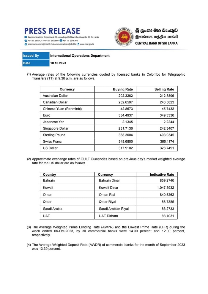 The Sri Lankan Rupee has appreciated slightly against the US Dollar today (Oct 10) compared to Monday, according to the Central Bank of Sri Lanka.